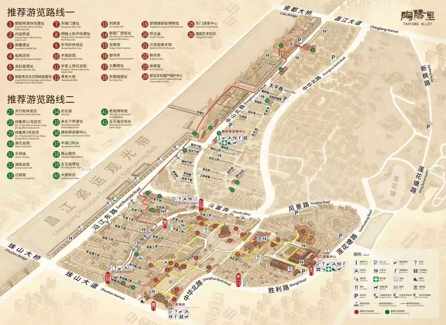 御窑遗址线(黄线):游览内容丰富,商业业态相对集中,基本覆盖陶阳里旅游区内部景点,适合想要感受窑砖里弄文化的游客,非常推荐这条游览路线。