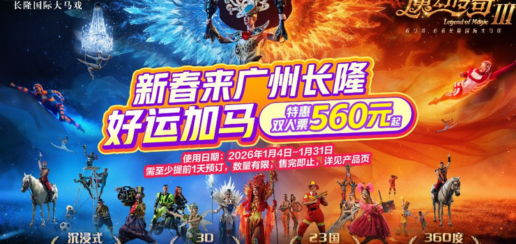 广州长隆国际大马戏精彩继续,2023全新巨制《魔幻传奇Ⅲ》给您带来震撼体验。全新互动式实景大马戏,从剧情演绎到舞美视觉全面重磅升级,自然女皇和冰火公主拉开传奇序幕,带领观众们穿越全新的魔幻世界。更有阵容空前强大、空前豪华的马戏巡游表演加持,带你从浪漫星河步步瞬移至亦真亦幻的魔幻空间,感官震撼不断加码,让你大呼过瘾。