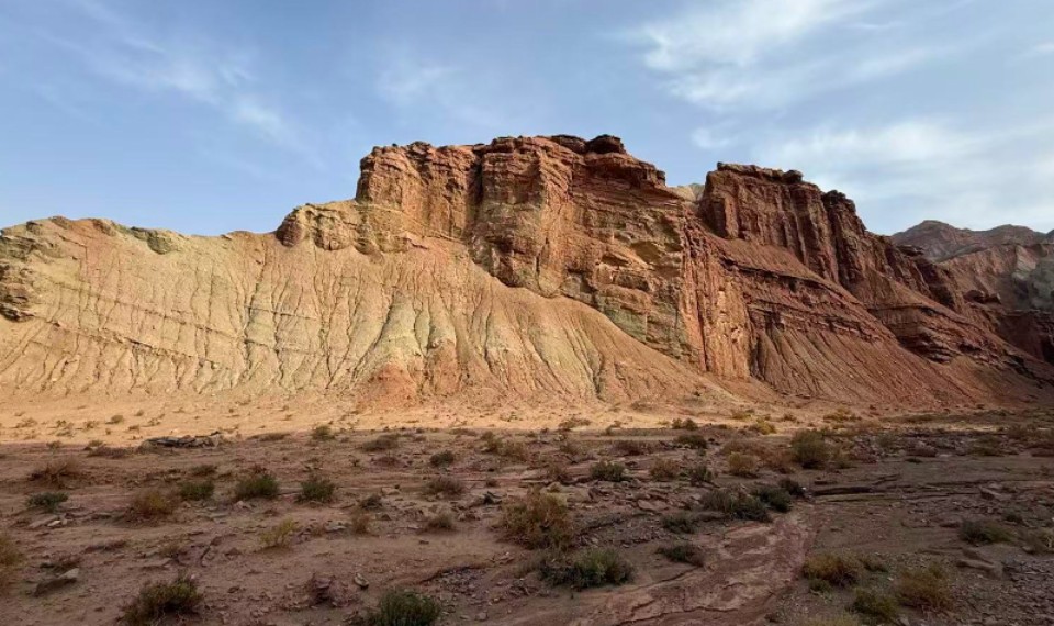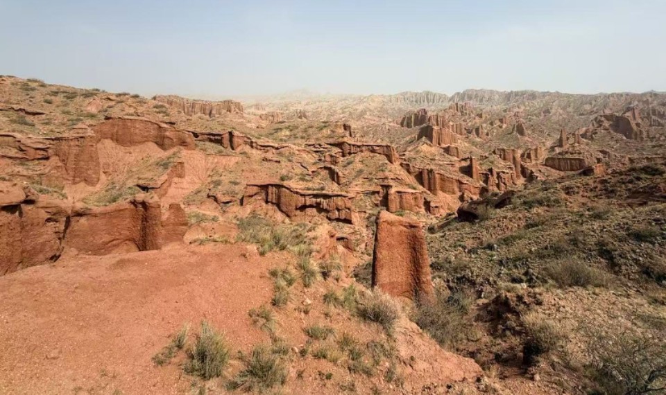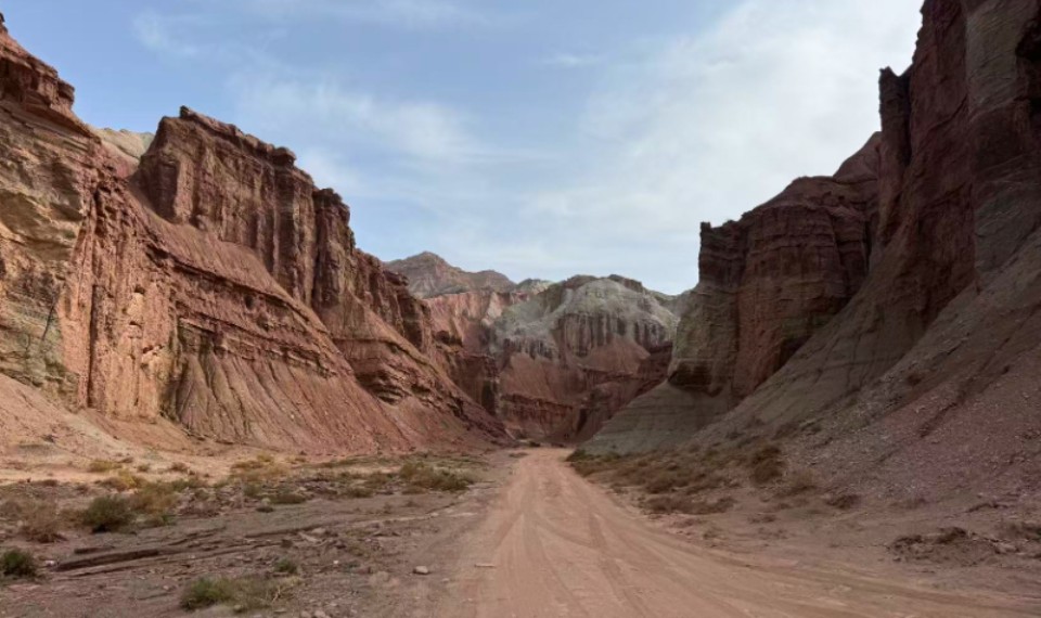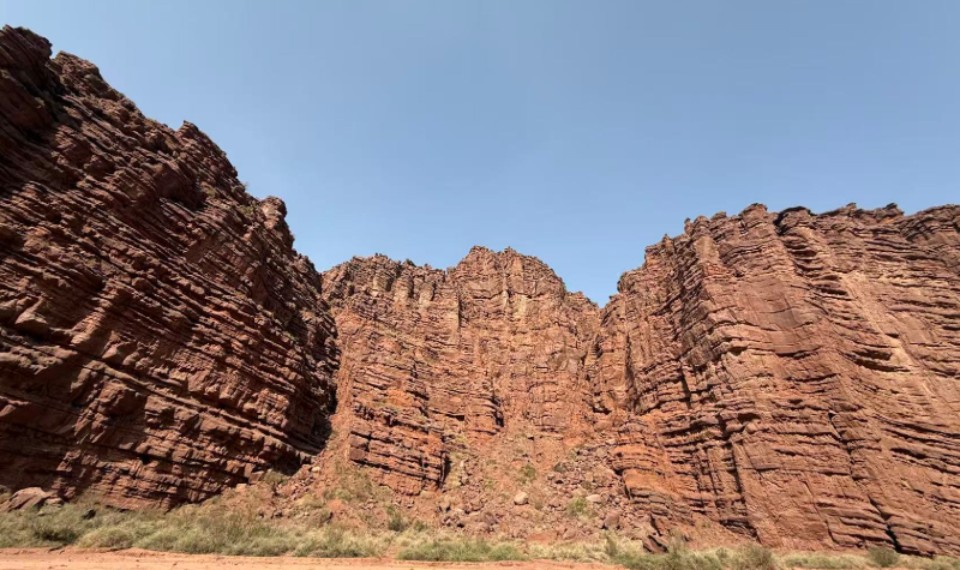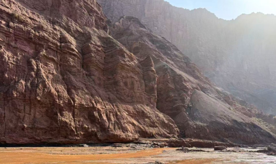 新疆阿克苏温宿县境内的库都鲁克大峡谷,维吾尔语是“空旷”的意思。这是一个新近发现、还未正式开发的大峡谷。 峡谷内群峰林立、沟谷纵横,景色十分壮美。置身其中,仿佛进入迷宫,而展现眼前的座座山峦像堡垒,像宫殿,又像楼阁亭台;群峰雄奇伟岸,气势磅礴,通体透红,令人震撼。视野时而开阔,时而闭塞,峰回路转,又别有一番天地。刚才还徜徉在数百米宽的沟谷和群峰耸立的广阔天地,瞬间又一处阴暗狭窄的沟谷呈现眼前。抬眼望去,断崖悬挂头顶,令人不寒而栗。那悬于峡谷高处的一线天际,仿佛给人们带来一线绝处逢生的光明和希望