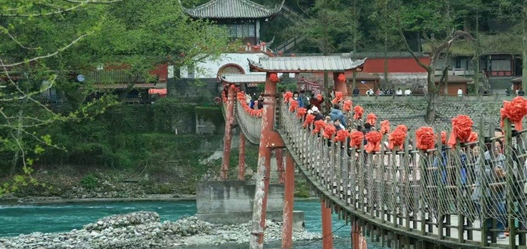 安澜索桥,位于都江堰鱼嘴之上,横跨内外两江,远看如飞虹挂空,又像渔人晒网,形式十分别致。漫步桥上,西望岷江穿山咆哮而来,东望灌渠纵横,都江堰工程的概貌及其作用,更是一目了然。