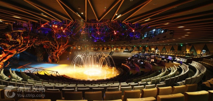 20亿打造6D水陆舞台,仅30秒就能完成干湿水陆舞台瞬间转换,国内首座立体3D空中飞行技术,精准计算的飞行路线,体验现场立体魔幻3D飞行的超刺激视感。1400立方米的中央升降台,数百个扬声器,立体式环音系统,104个分布于全剧场的立体水特效装置,270度广角观演体验水陆自由转换的水处理控制系统,尖端科技的凝聚,让这场盛宴如虎添翼。