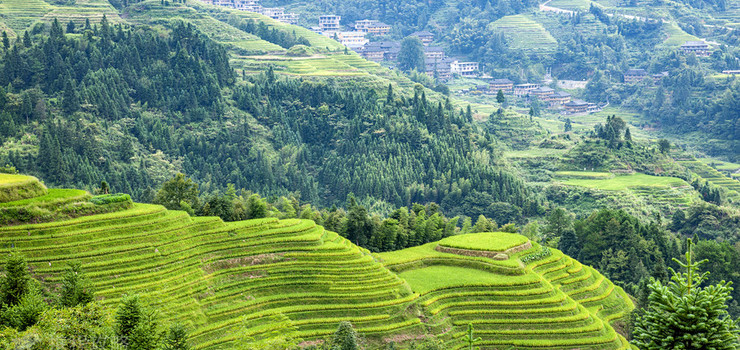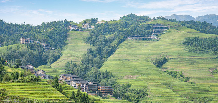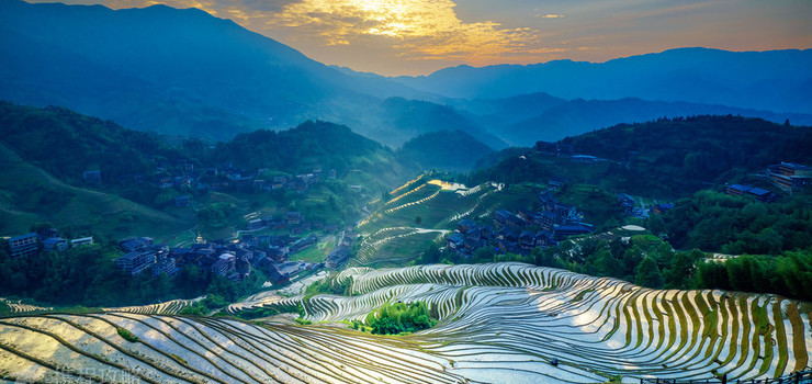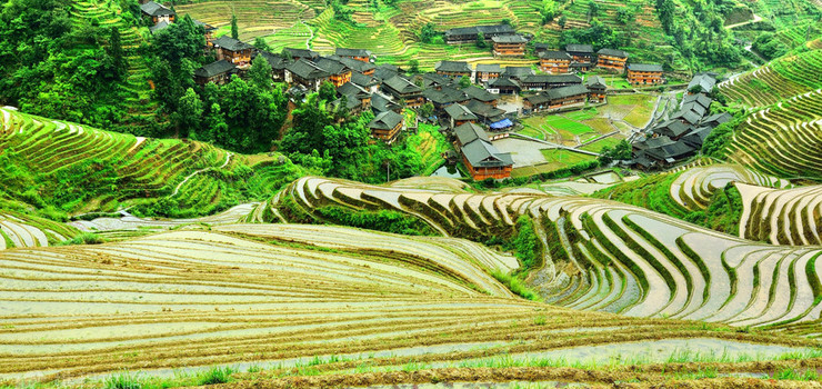 在龙胜县东南部和平乡境内的平安村,有一个规模宏大的梯田群,全部的梯田分布在海拔300-1100米之间,一层层从山脚盘绕到山顶,层层叠叠,高低错落。其线条行云流水,其规模磅礴壮观,被称为“龙脊梯田”。龙脊梯田始建于元朝,完工于清初,距今已有650多年历史。人们建设家园的智慧和力量,在这里被充分地体现出来。