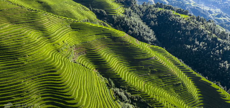 龙脊梯田从山脚盘绕到山顶,小山如螺,大山似塔,层层叠叠,高低错落。从高处望去,梯田的优美曲线一条条、一根根、或平行或交叉,蜿蜒如春螺、披岚似云塔,显示了动人心魄的曲线美。其线条行云流水,潇洒柔畅;其规模磅礴壮观,气势恢弘,有“梯田世界之冠”的美誉。