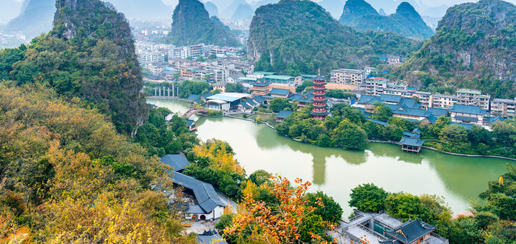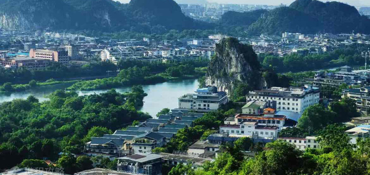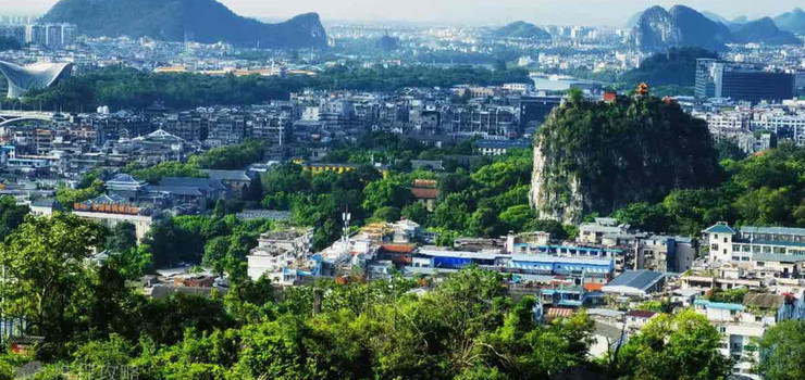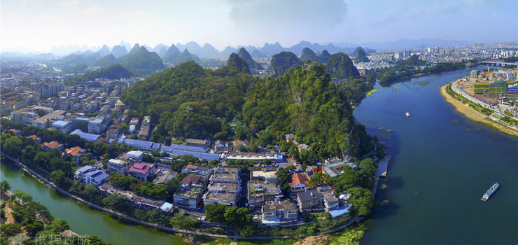 桂林市北的叠彩山,因其山上桂树多,叠彩山又名桂山,不过虽然如此,使叠彩山出名的并非其满山的桂树,而是山上层叠的石头,放眼望去如一层层的锦缎堆积,唐代诗人元晦的《叠彩山记》上是这样描写的: