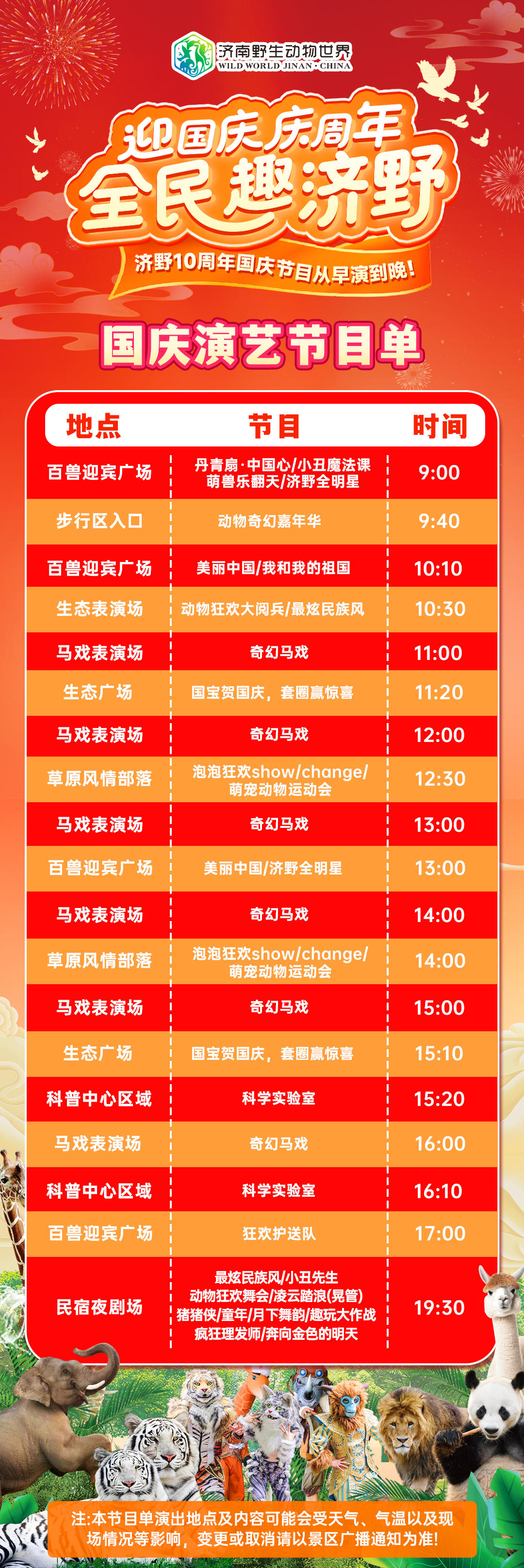 园区共分为南北两大部分,北部为步行游览区,南部为乘车游览区。步行游览区以“主题式”展示分区,由鸟鸣花谷、吉象领地、虎啸山谷、生态表演场、雪国圣境、林梢王国、熊猫馆、花豹小径、獴哥密室探险、青龙印象、河马犀牛、歪歪猫亲子乐园等12个区域组成。
