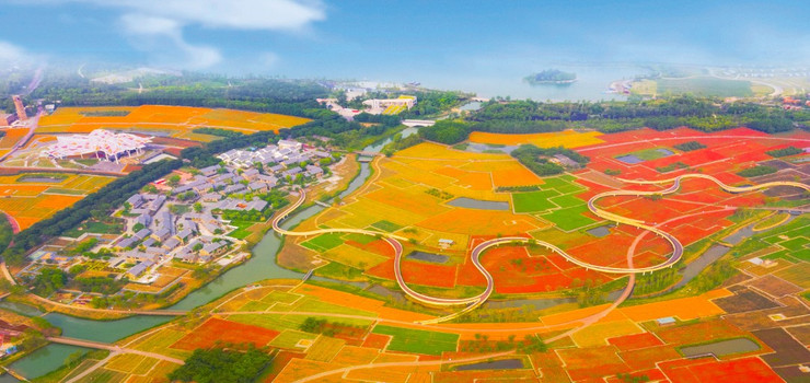位于整个景区东侧,总面积约2220亩,由612块花田缝补拼接而成,融合了北方旱梯田的雄浑和南方水梯田的俊秀,与僧人袈裟异曲同工。栽植着50多种花卉,自南向北形成黄、红、紫三大色区。全长2.3公里的彩虹桥俯瞰花海,听花开花落,嗅浓郁芬芳,感受浓浓的原乡情怀。