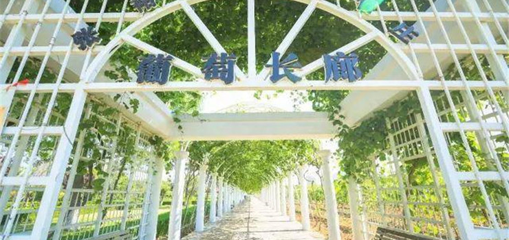 葡萄公园背依浩瀚大海,与金沙滩相伴,风光迤逦。上千亩葡萄园里种植了180多种来自世界各地的名贵葡萄, 500米鲜食葡萄长廊秀美壮观。迎宾台、沧浪小溪、醴泉湖,勾勒出一幅自然和谐的画卷