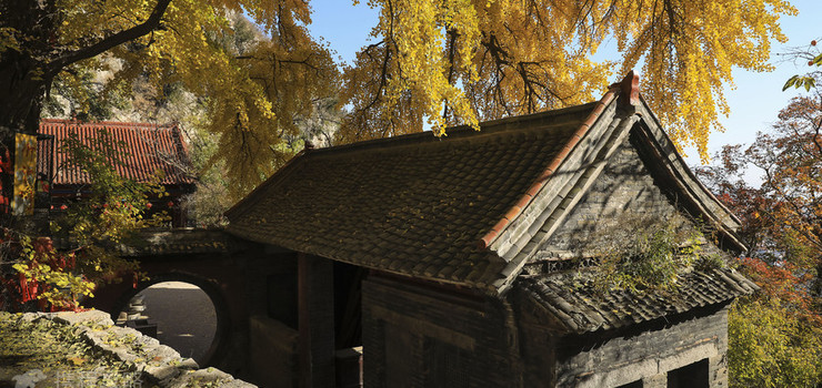 进山门沿青石曲径拾阶而上,自然植被交错遮日,千年银杏沐浴金风。