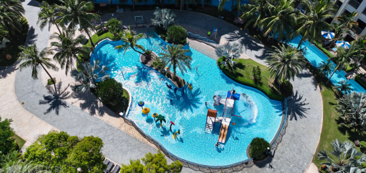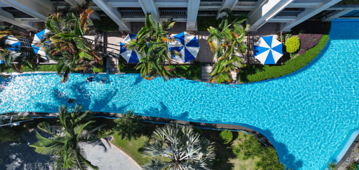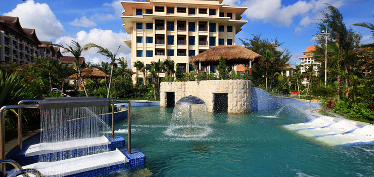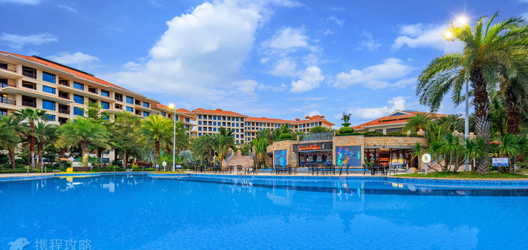酒店内的温泉透着浓郁的东南亚度假风情,整个温泉园区分为四个板块:六福洞天区、揽海养颜区、步浪区、叠海区。漂流河上有慕海、望海、观海、听海四座桥横跨上方,使得各泡池联系紧密又有各自空间。