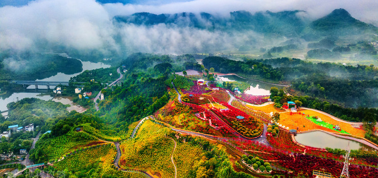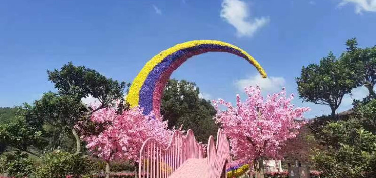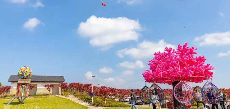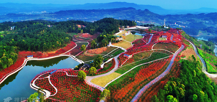 整个园区从西往东形成人工种植展示区、湖区和山地自然生态山林三个区域,并根据当地气候、土壤等条件在园区内种植了红枫、玫瑰、桃花、樱花、杜鹃、格桑花、虞美人等多种观赏类花草树木。