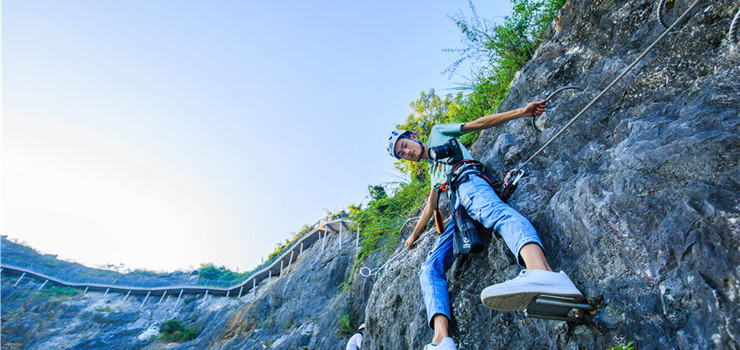 飞拉达攀岩也称铁道攀岩,是7-70岁的人都能攀上绝壁,普通人也能飞檐走壁的有惊无险的户外运动。薄刀岩长约80米、高约100米,两边陡崖,顶部宽度一般不足0.5米,窄处不足20厘米,宛如一片巨型弯刀连接空中花。