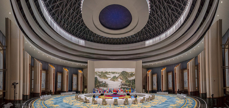 午宴厅以“仁”为主题。领导人通过主会场两侧扶梯到达五层的午宴厅。穹顶正中为星空景象。中环为自然天光照亮室内空间,外环为五圈闭合叠加的水墨山水长卷,整体午宴厅表达了东西方文化的共识,以及在面对自然环境以及生态尊重的观念上共同的价值观。