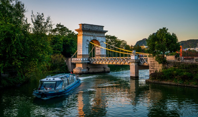 简单说吧,如果船是由上游来的呢,先打开上游方向的闸门,让两个闸门中间的水位和上游持平,然后船就可以通过闸门了,船进来之后关闭上游方向的闸门,打开下游方向的闸门,船不动,水自然就会降到和下游持平的状态啦!不用去三峡在桂林就可以近距离体验!