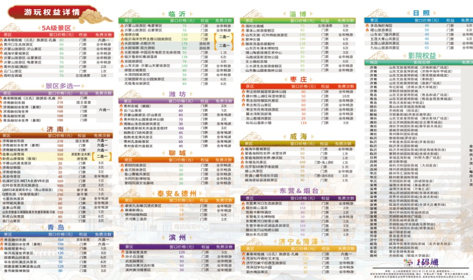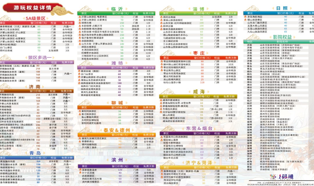 “好客山东一码通”是由山东文旅集团山东文旅云智能科技有限公司建设、运营的全省文旅电子年卡权益类会员产品,旨在立足文旅市场,满足游客日益的增 长文旅消费需求,降低游客出行门槛,实现“一码在手 畅游山东”“好客山东一码通”整合全省约百家景区及影院等本地生活类文旅资源,打通预约码、验证码等数据系统,构建文化旅游生活生态联盟,打造一码通订、一码通验、一码通行的便民、利民、惠民的智慧文旅畅行系统,塑造文旅消费新场景、新模式,用户购买后可享超万元文旅权益。