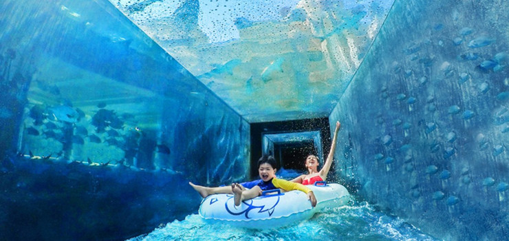如果还没有做好挑战高难度项目的准备,您可以选择鲨鱼穿越给自己做一下热身运动。从相对平缓的滑道进入为鲨鱼所环绕的隧道,随着水流缓缓前行,将有悠然与惊险交替之心得。