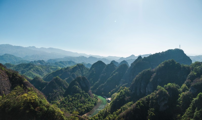 其方圆10千米,由东线(百卉谷)、西线(一线天)、神仙寨以及桃花岛四部分组成,山形峻秀,岩壑争奇,是典型的丹霞地貌,系3千万年前元古代造山运动开始发育,后经漫长的地质作用形成。