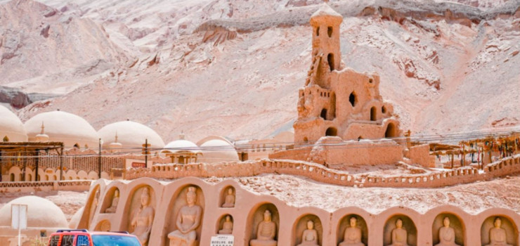万佛宫以“丝路古堡”、“哈拉和卓”、“铁扇公主”、“唐僧讲经”、“弥勒佛”、“观音堂”等大型雕塑迎接络绎不绝的中外游客。这片景区由20个景点组成,内容相当丰富,上自古老的神话传说,下至民族习俗、乡土风物,均有概括的表现。