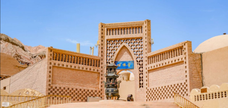 万佛宫占地面积3万平方米,依山傍水,又临近312国道,交通方便,自然环境优美。园区内高大的伊斯兰风格建筑,古色古香,别具风味。走进高达10多米由土砖坯砌成的图案精美的拱门,迎面是由3座穹窿顶建筑组成的万佛宫,中心正厅有坐佛一尊,10米高的彩绘大佛雄伟壮观,气派不凡,是依据焉耆出土的雕塑精品红衣佛放大塑造的,是新疆第一大坐佛。