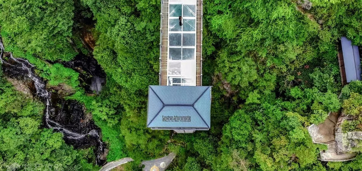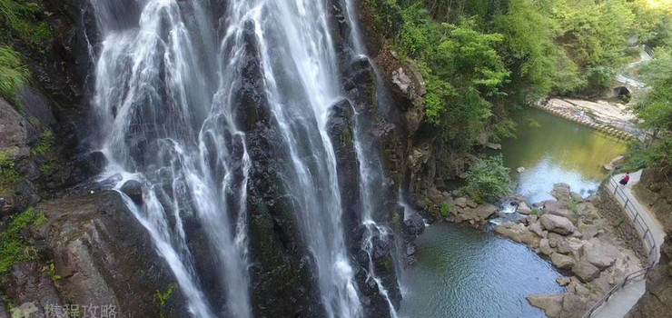 三面危崖相逼围成圆形巨穴,澄溪之水,忽从高40余米的断崖跌落穴底,形成七级首尾相接、各异其趣的瀑布。