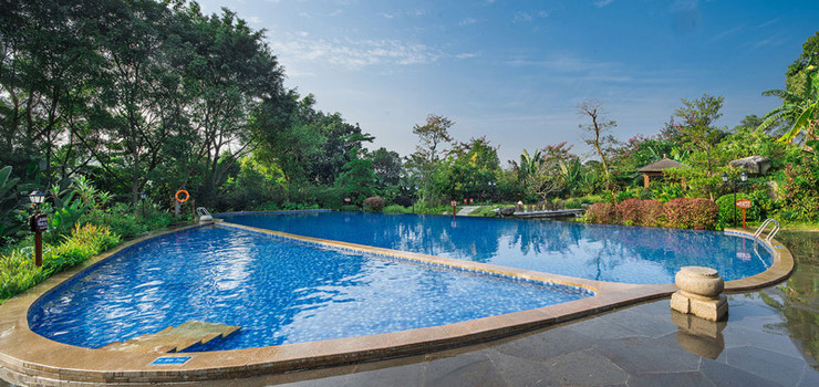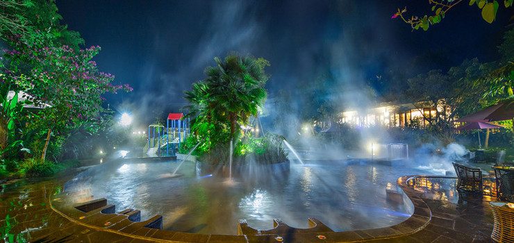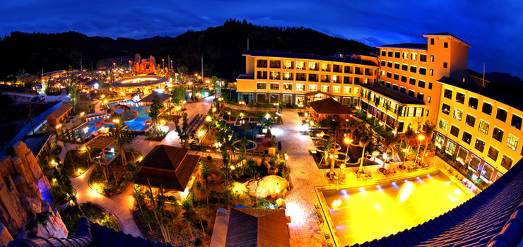 拥有大型SPA水疗池、露天日式温泉池、室内温泉池以及十余种纯中药温泉池、鲜花池等各类温泉泡池30多个。此外,酒店提供绿色、健康的原生态特色餐饮,餐厅设200多个餐位及多个豪华贵宾厅。