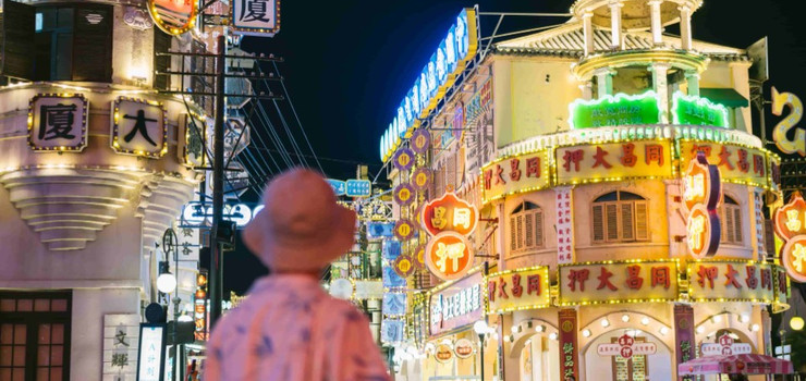 穿越,不仅仅是扑面而来的一栋栋19世纪香港风情的主题建筑,而是真真切切置身于栩栩如生的电影版街景中—入夜时分,整个港城区被五颜六色的霓虹灯照亮,成了一座影视主题的不夜城。