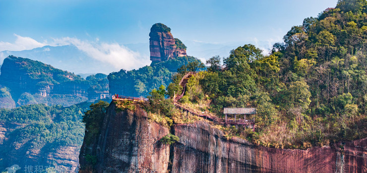丹霞山风景区位于中国广东韶关市东北郊,丹霞山风景区的地貌由六百八十多座顶平、身陡、麓缓的红色砂砾岩石构成,以赤壁丹崖为特色,称为丹霞地貌,丹霞山区是一个大型内陆盆地,受喜马拉雅山运动影响,四周山地强烈隆起,盆地内接受大量碎屑沉积,形成了巨厚的红色地层,属于红层地貌。山上红色砂岩经长期风化剥离和流水侵蚀,形成孤立的山峰和陡峭的奇岩怪石,巨厚红色砂、砾岩沿垂直节理发育。
