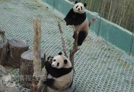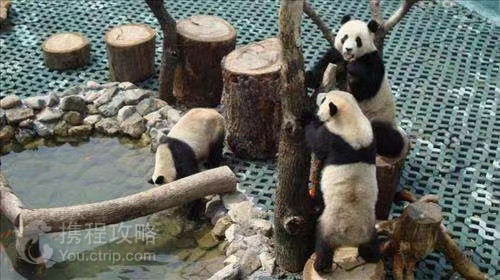 池中黑白卵石镶成的图案与建筑相呼应,池边一圈矮石柱与水池相切,别有情趣,生活在其中是三只熊猫明星:淘淘、欢欢、福娃。它们淘气的不搭理游客,或是与游客偶尔互动,或是悠然睡觉,这可爱的模样讨得大家对其的喜爱。