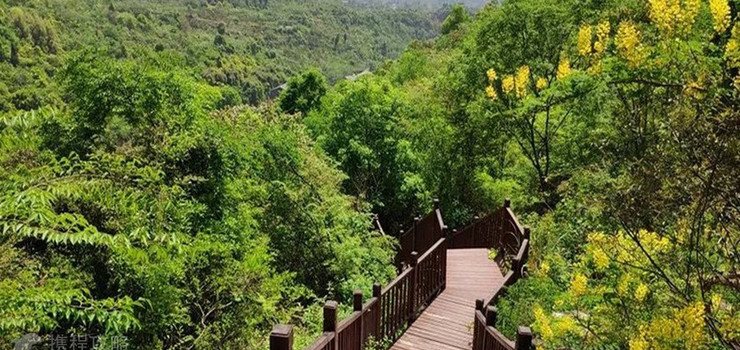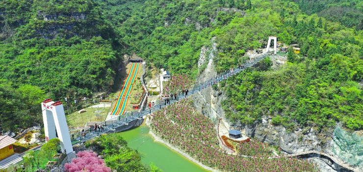 2018年5月竣工的踏云桥为这里的休闲游增添新活力。这是宜昌城郊座玻璃悬索桥,全长130米,桥面与湖面的相对高差近 100米,设计可承载300人。踏云桥与五指山崖壁玻璃栈道连为一体,全部使用钢化玻璃建成,成为一道独特的透视景观。桥下更是“四季花坞”花开不断,站在桥上鸟瞰,惊魂之余更多了一份花香幽静,“亚历山大”瞬间消失。