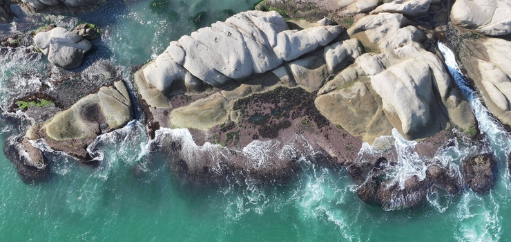 成山头的沿海边缘,林立着各种形态的石林,海浪冲过石林,激起雪白浪花。