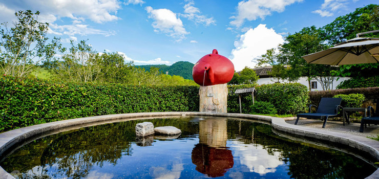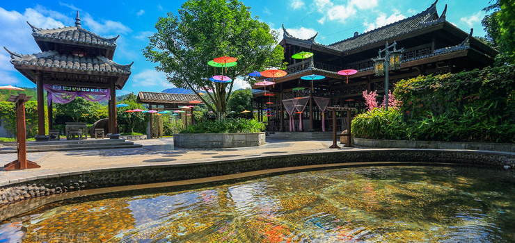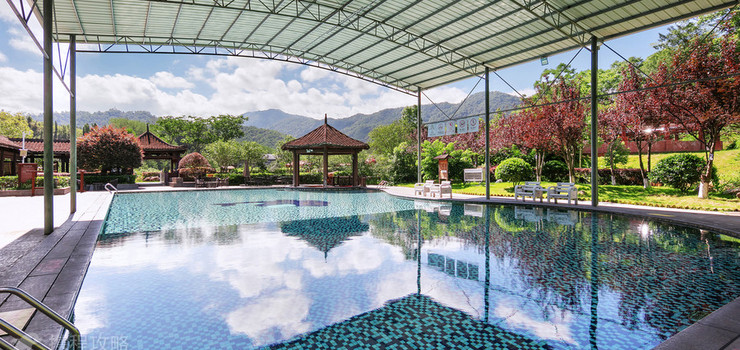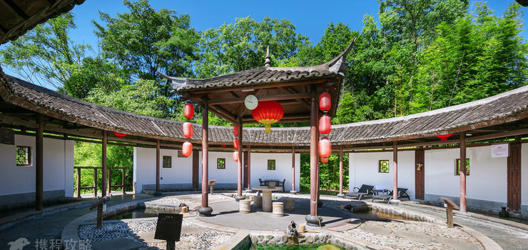 园区亭台楼阁、青砖灰瓦、飞檐翘首、雕龙画栋,彰显浓郁客家文化风情。在这里,泡汤已化身为提升心灵的养生艺术:浴佛池的花瓣闻尽花之香;石板温泉更是享受温热云石的舒体之效。在这里,可以吃温泉蛋,甚至享受私密温泉的乐趣。