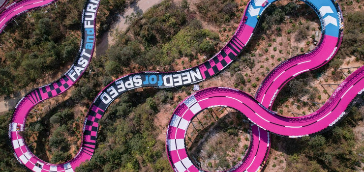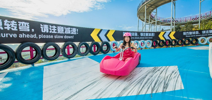 生而不同,独具个性的粉红色赛道,致敬特立独行的态度,创意营造潮酷新场景。全程近2000米,粉色山地架空赛道全长1270米,落差近百米,形成11个S弯, 5个360°回旋,游客可以沉浸体验赛车手的速度与激 情。