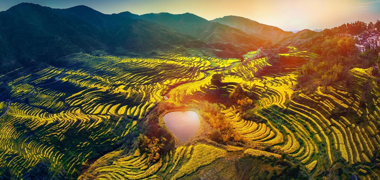 每到春天,万物复苏,嫩黄的油菜花漫山遍野,铺满了山间的每一寸角落。满眼揉碎的金黄,在阳光的照射下,刺眼、明亮。山间里充满了春天泥土的芳香。千亩油菜花海,万亩良田美景,婺源油菜花海,果然名不虚传。也许是油菜花海的名气太大了,慕名而来的外国友人络绎不绝。 在花海中有一座爱心田,它夹于两山之间,未经人工雕琢,而充满了原始的野趣风味。除了春季,漫山遍野金黄色的油菜花点缀其中,夏天雨后,山间弥漫的咧咧清新与风儿吹过紫薇园一抹淡淡的香味,又为爱心田笼罩了爱的独特味道。痴男怨女的纷至沓来,爱心田成为了情侣眼中公认的爱情地标。