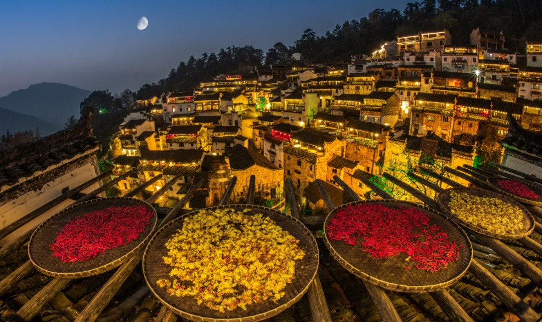 挂在山崖上的篁岭古村,“地无三尺平”,数百栋徽派民居在百米落差的坡面错落排布,每当日出山头,晨曦映照,整个山间房屋晒架上五彩缤纷的丰收果实,绘就出美丽的“晒秋”农俗景观。春晒茶叶、夏晒山蕨、秋晒果蔬、冬晒乡俗……一年四季延绵有续。