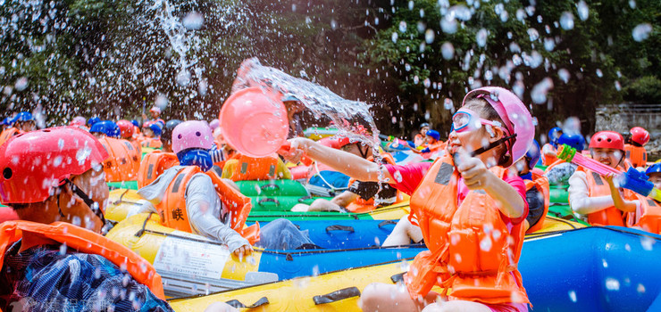 嬉水区:接近漂流终点,水面相对宽阔和缓,考验游客的体力与控筏能力,也可以寻宝嬉水打水仗。