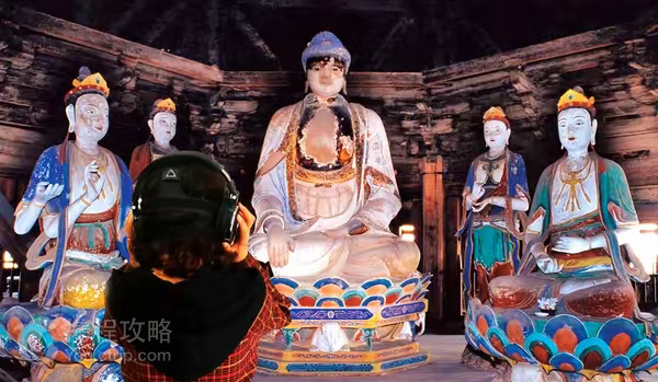 该塔身底层南北各开一门,二层以上周设平座栏杆,每层装有木质楼梯,游人逐级攀登,可达顶端。二至五层每层有四门,均设木隔扇,光线充足,出门凭栏远眺,恒岳如屏,桑干似带,尽收眼底,心旷神怡。塔内各层均塑佛像。一层为释迦牟尼,高11米,面目端庄,神态怡然,顶部有精美华丽的藻井,内槽墙壁上画有六幅如来佛像,门洞两侧壁上也绘有金刚、天王、弟子等,壁画色泽鲜艳,人物栩栩如生。二层坛座方形,上塑一佛二菩萨和二胁侍。三层坛座八角形,上塑四方佛。四层塑佛和阿傩、迦叶、文殊、普贤像。五层塑毗卢舍那如来佛和人大菩萨。各佛像雕塑精细,各具情态,有较高的艺术价值。