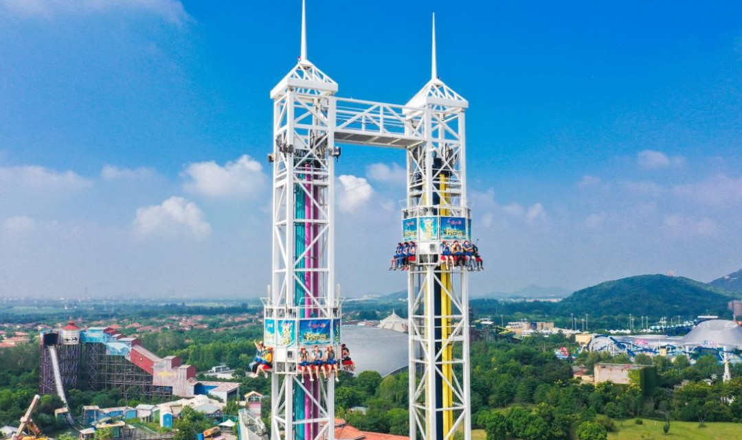 双塔式太空梭,一座塔由下而上高速弹射,另一座则由上而下急速降落。上下往复中,完美融合了弹射与坠落的两极体验。