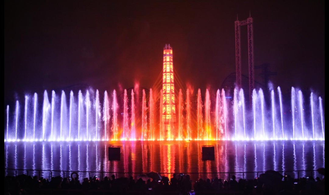 上海欢乐谷大型跨媒体实景水秀《天幕水极》,由国际团队法国ECA2耗时2年设计、指导,以“天地初开、永恒之剑”的中国神话故事为背景,运用水幕、喷泉、音乐、全彩激光、3D影像、焰火等国际□新的多媒体艺术和技术成果,呈现水火交融、电光流影、时空穿越的全感官浸入式震撼体验。