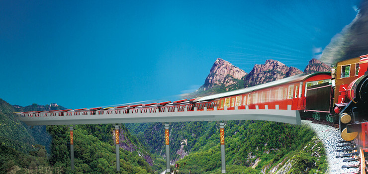 悬壁火车运行于海拔480米的陡峭山腰,双向往复行驶,单列车长58.6米,可同时载客180人。悬壁路总长3000米,设4处站台,跨6座悬空桥。桥梁专为修建铁路而架设,其中黄金湾大桥为壮观,桥高50米,长168米。乘火车移步换景可穿山越谷、俯瞰黄金寨全貌,体验惊险刺激,领略无限风光!