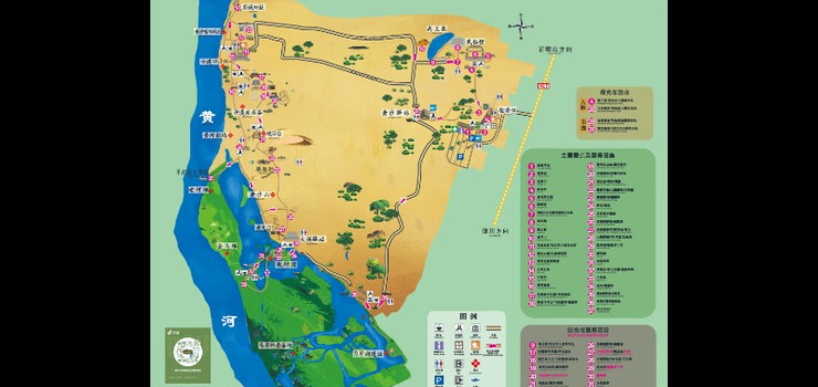 园区深入挖掘了黄沙古渡历史文化,恢复了黄龙台、黄沙嘴、宁河台、禹王阁、观日台、禹王井、黄龙镇河、古渡口、黄河渔村、黄河古镇、古渡人家、黄沙古渡黄河楼、浑怀障、芦荡飘雪、黄河人家、古渡、黄河小镇、大漠孤烟黄河落日、烽火台、横城古渡、横城堡渡黄河、朱栴巡边、康熙渡黄河、黄河古韵、昭君出塞和亲雕塑等古迹景观;复原了大漠驼场、漠北大营、黄河滩老羊圈、黄河古道、塞外老牧场、治沙人家。