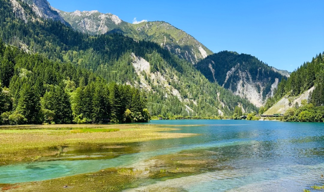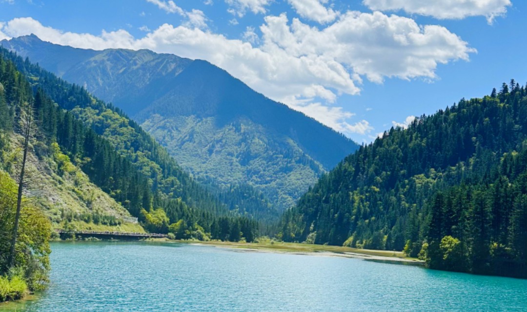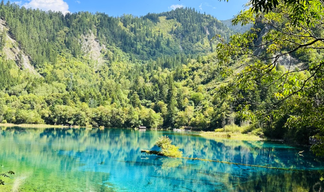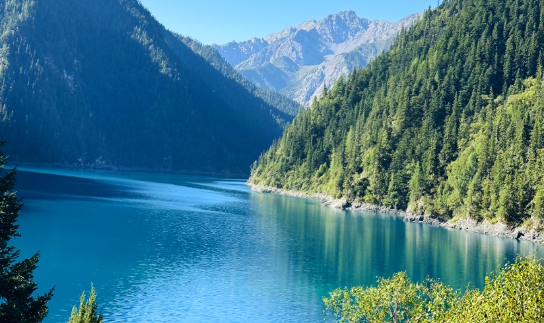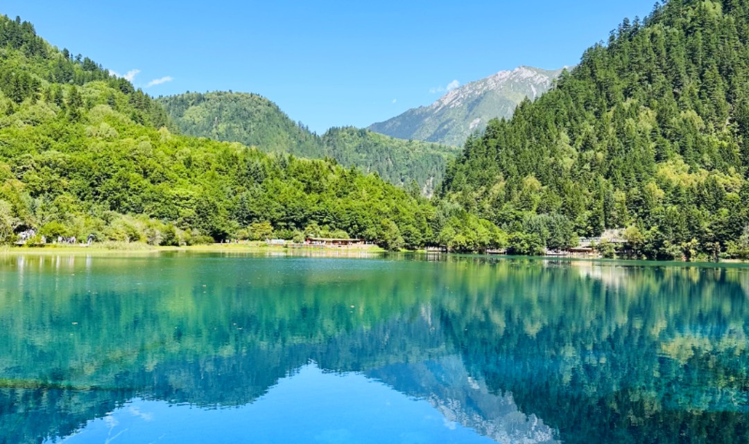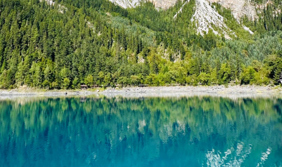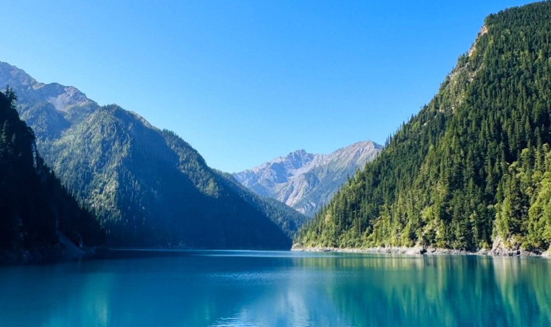 镜海,湖呈狭长形,长约一公里,为林木所包围,对岸山璧像一座巨大的石屏风。它就像一面镜子,将地上和空中的景物毫不失真地复制到了水面,所以镜海的倒影独霸九寨沟。