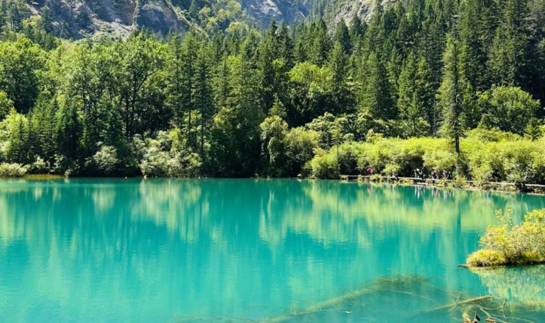清澈多彩的湖面下显现出一段段的树木躯干。湖面整体呈绿松色,不同区域,颜色变换从黄色到绿色,又到蓝色,展现出湖水五彩的美艳。