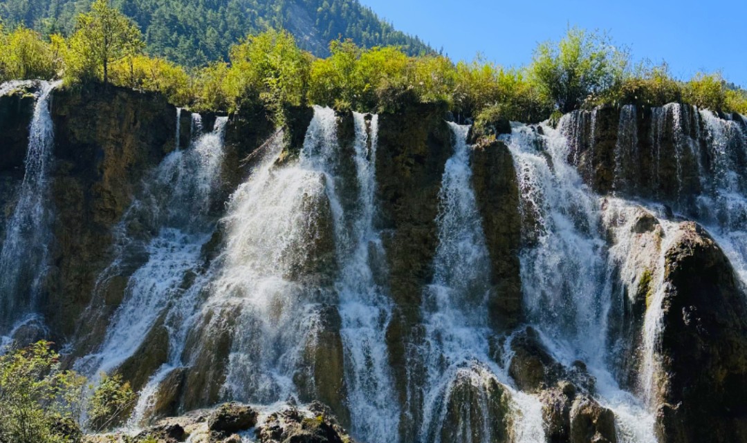 九寨的翠海、叠瀑是九寨水的组成。湖水终年碧蓝澄澈,明丽见底,而且随着光照变化、季节推移,呈现不同的色调与水韵;瀑布从密林里狂奔出来,或在高高的翠岩上急泻倾挂,或从山岩上腾越呼啸,朝阳照射,常常出现奇丽的彩虹,使人赏心悦目,流连忘返。
