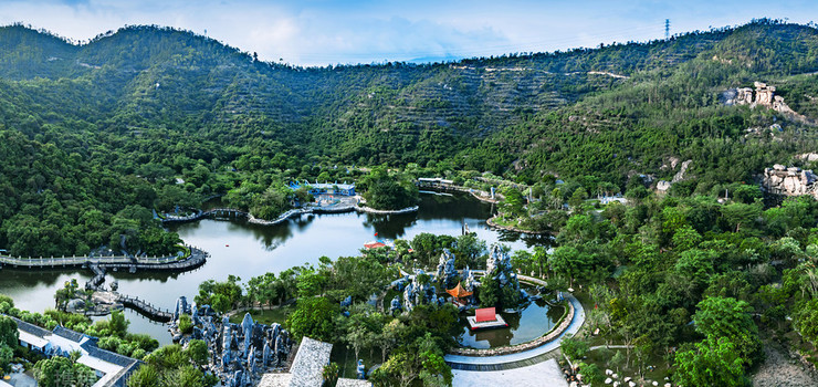 由我国园林名石——广东英石、江苏太湖石以1:1000倍比例按广东岭南派画家林风俗教授的水墨山水名画为蓝本放样砌成。
