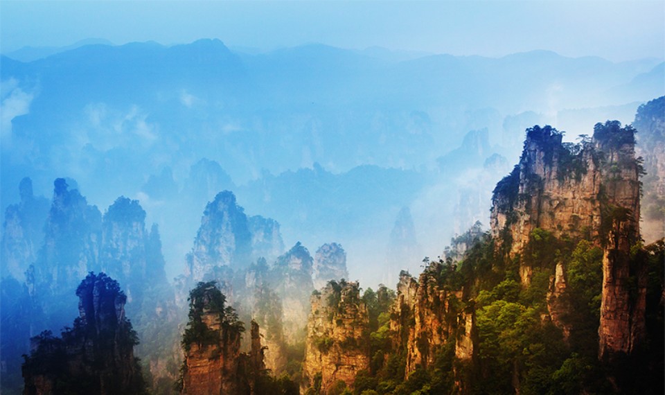 袁家界景区是一个山地高台,这里树木茂盛,有雾气弥漫、群峰叠嶂的美景。同时,也是电影《阿凡达》中的悬浮山“哈利路亚山”的取景地。