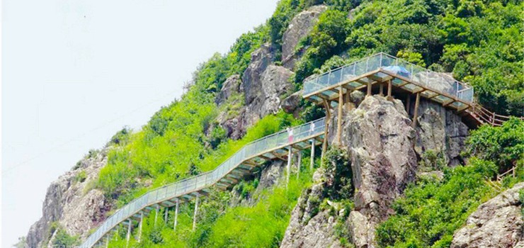 栈道沿山凌空而设,垂直落差约150米。玻璃栈道采取生态化施工,保留原有树木。走在栈道上,一边欣赏葱茏叠翠的植被,另一边可俯瞰蟹钳港的迷人风光。