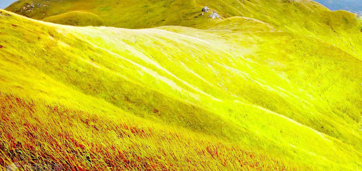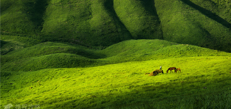 这是一片面积约5000亩,四周被阔叶和针叶混交林包围的草场。周边的山峰巍峨挺拔,充满阳刚之壮美。草场核心区的山岚远远望去,又如人工泥塑的微型盆景。草山低矮,绵延起伏;山脊走势,富有韵律,节奏中蕴含着温文典雅之美妙!