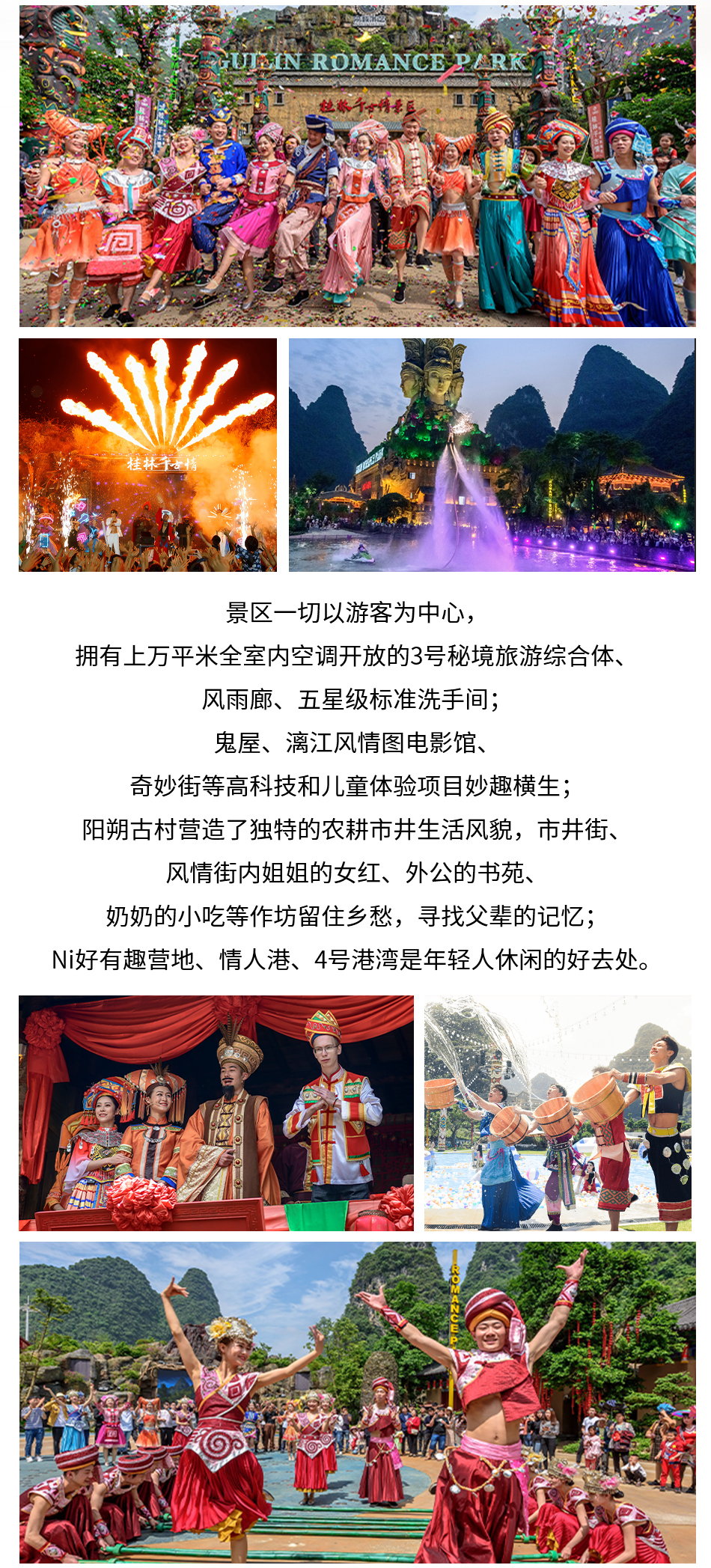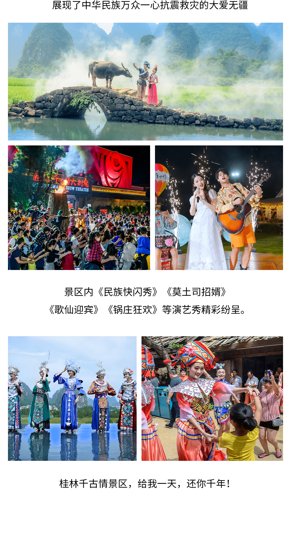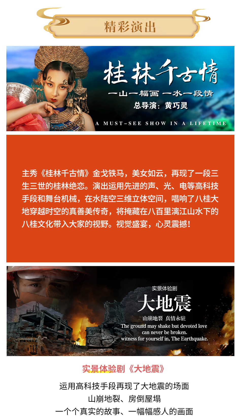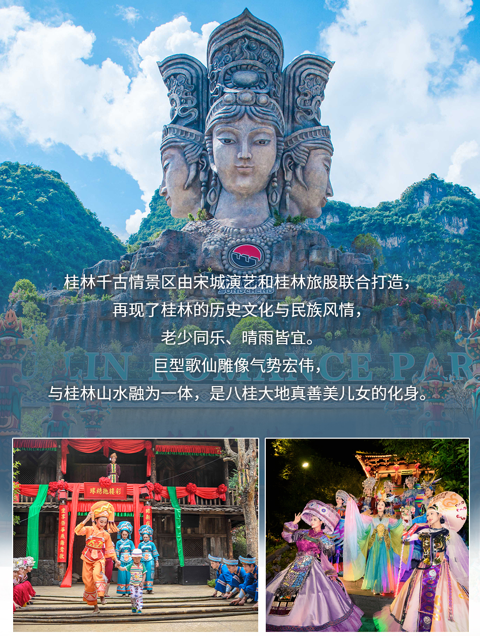 由宋城演艺和桂林旅股联合打造的桂林千古情景区,再现了桂林的历史文化与民族风情,老少同乐、晴雨皆宜。核心演出大型歌舞《桂林千古情》是一生必看的演出,视觉盛宴,心灵震撼,唱响了一曲感天动地的桂林千古传奇。