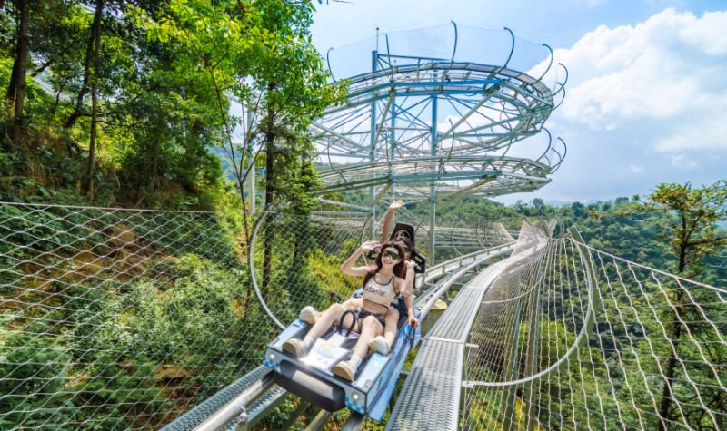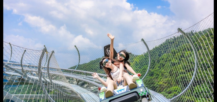 峡道飞车的起点,坐落于悬崖飞车的终点位置,与惊险刺激的悬崖飞车首尾相连,丝滑相扣,共同构成了绝妙的“双飞”组合。游客们在云天玻霸游玩步行下山后,或者体验完悬崖飞车,即可通过魔毯快速抵达峡道飞车起点,无需耗费体力,便可漂移下山,真正实现了山一步不用爬,景一处不落下,在畅享速度与激情的同时,饱览大自然的鬼斧神工。