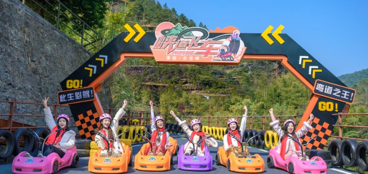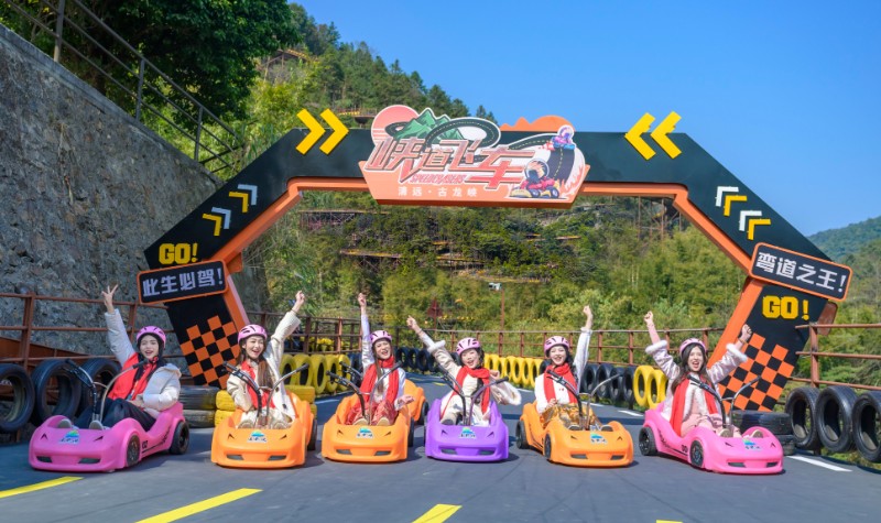峡道飞车全长3680米,犹如一条天路盘旋在巍峨的古龙山脉之上,跨越3座山峰,依山取势,蜿蜒起伏,一弯接一弯,全程落差高达260米,**时速可达30km。赛道设计融合了多种复合型弯道,包括多个直角弯、发夹弯、360度螺旋弯、8字回旋弯等28个极具挑战性的弯道。其中“9连发夹弯”超越了以“5连发夹弯”闻名世界的秋名山赛道,是目前国内*长、弯道*多的山道滑车项目,九曲二十八弯,实至名归。