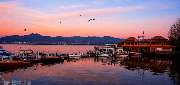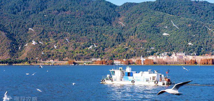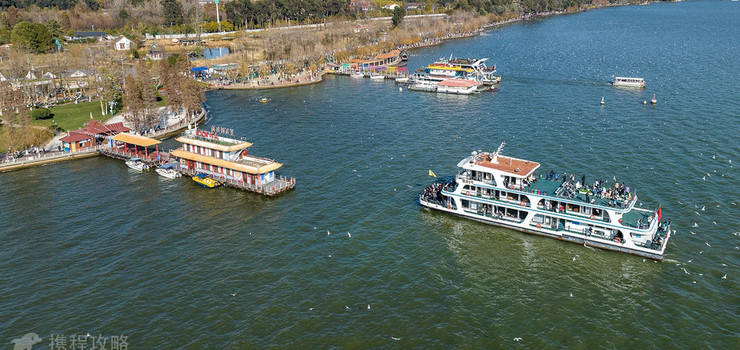 ⑤游船线路:坐在船上观看海埂公园沿岸景色——百年桉树——观海长廊——滇池接口——空中索道——眺望西山森林公园——西山龙门——睡美人山。